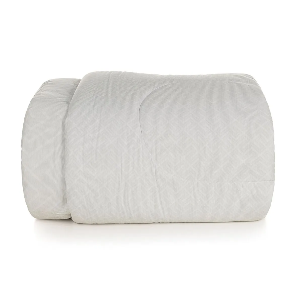 Combinação de Cores: Edredom de fundo branco com desenho geométrico por todo o corpo e verso liso.