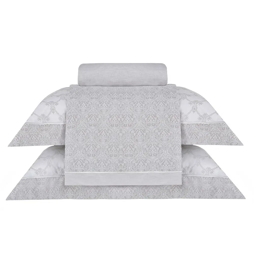 Confeccionado em Gran Percalle 200 fios de algodão 100% fio penteado com fibras longas, o tecido oferece maciez extraordinária, frescor natural e alta durabilidade. A estampa de arabescos ton sur ton traz fluidez e classe ao ambiente, enquanto o acabamento em ponto cheio na vira do sobrelençol e nas fronhas proporciona um toque de sofisticação artesanal.