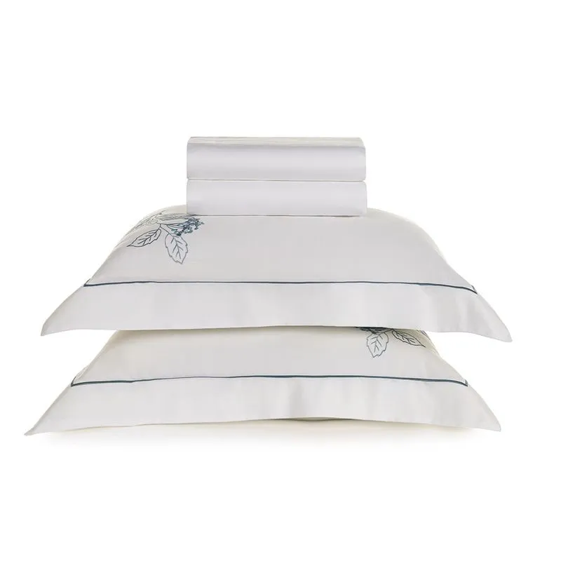 Descrição Visual: Fundo branco com bordado de flolhagens em tons azuis e ponto royal emoldurando as fronhas e sobre lençol com o mesmo bordado em tamanho ampliado em um dos lados do centro;