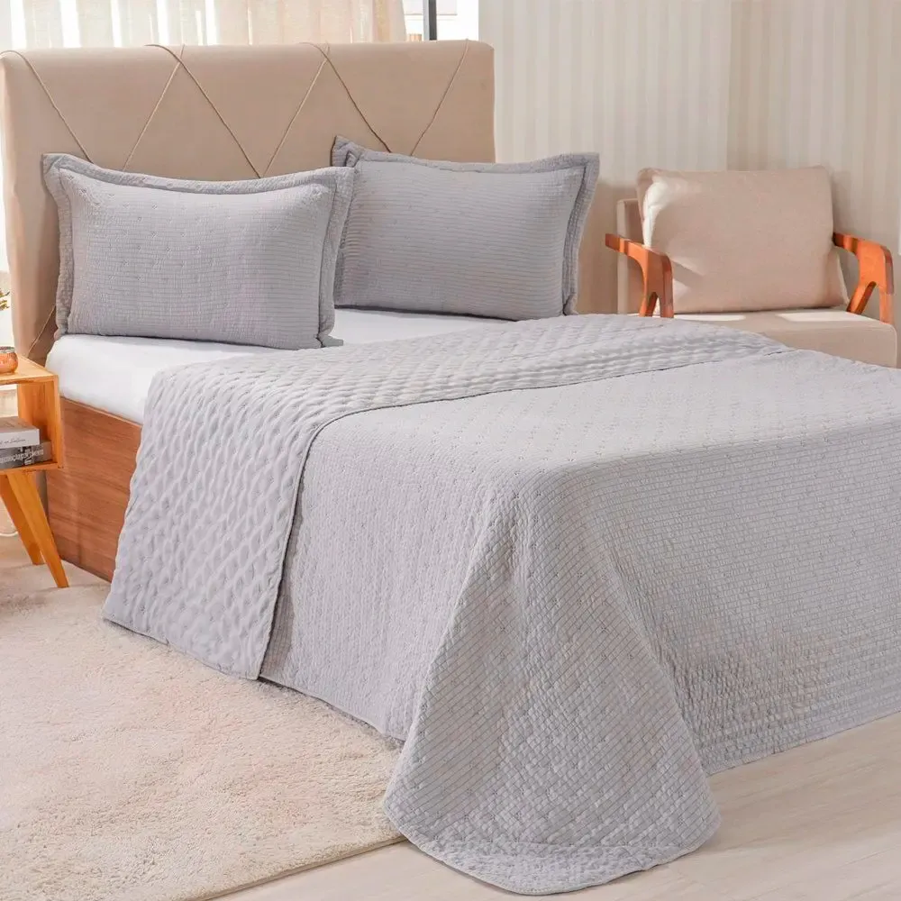 KIT COLCHA PLISSÊ SOLTEIRO PRATEADO