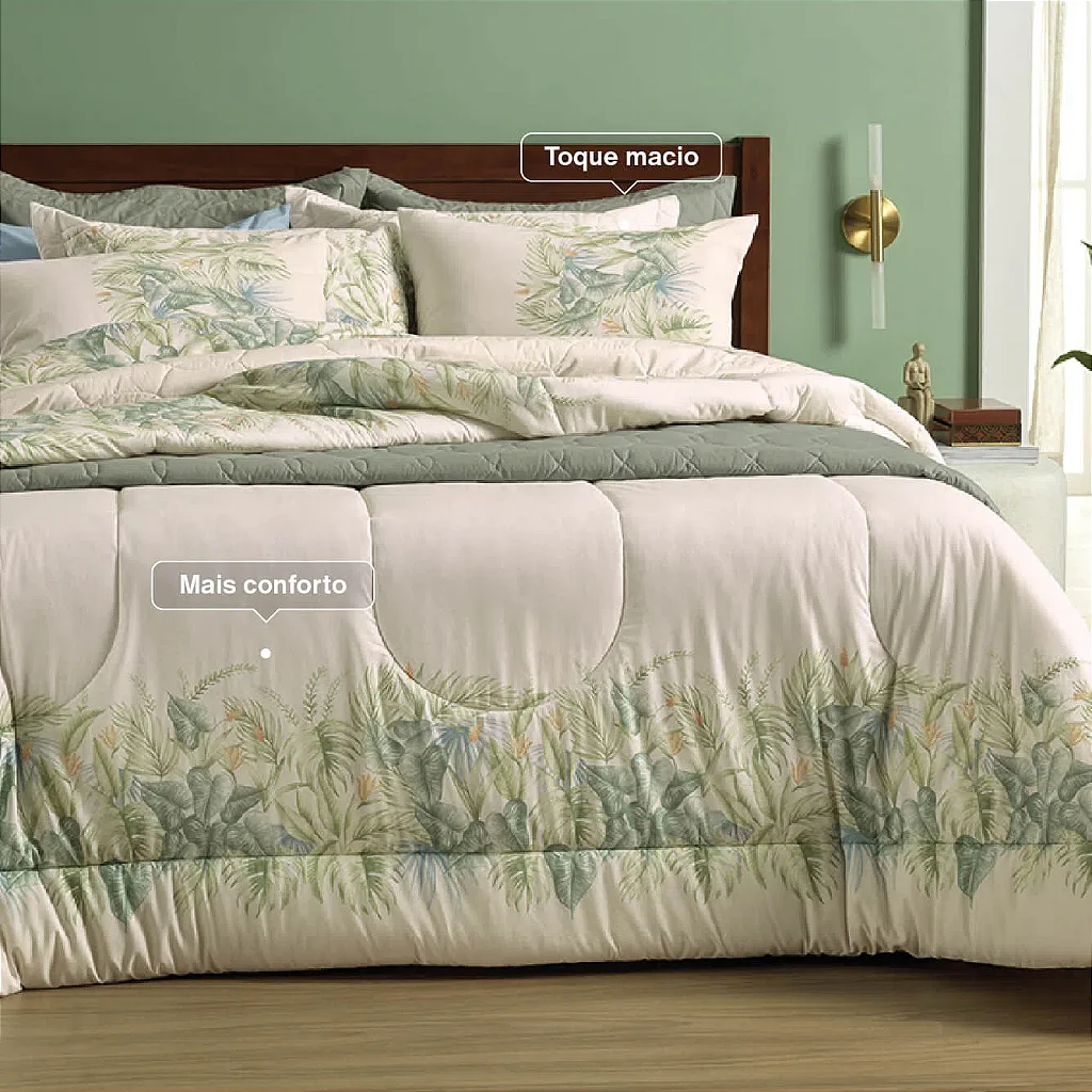 O Edredom Solteiro Lissa traz uma estampa de folhas deixando o ambiente delicado com um toque casual, facilitando composês em tons verdes e cinza. Possui confecção em 100% algodão 150 fios, deixando sua cama com um conforto e beleza incomparável!