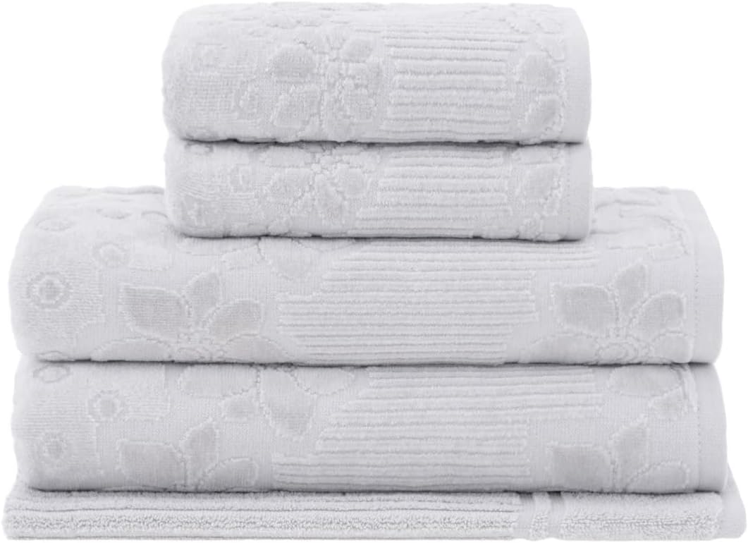 O Jogo de toalhas de banho Buddemeyer Lollipop combina charme e conforto em suas cinco peças em cinza. Confeccionadas em 100% algodão com fibra longa, oferecem um toque macio e volumoso. Seu design em veludo destaca cores clássicas e detalhes florais, proporcionando um visual elegante para qualquer banheiro. As toalhas são pré-lavadas e pré-encolhidas, garantindo durabilidade e alta capacidade de absorção para seu uso diário.