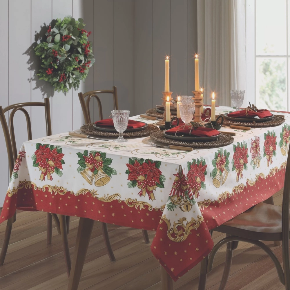 Toalha de Mesa Retangular Döhler Athenas 6 Lugares - Natal 107 - Características Gerais do Produto: Tamanho: 1,40m x 2,10m Composição: 50% Algodão 50% Poliéster.